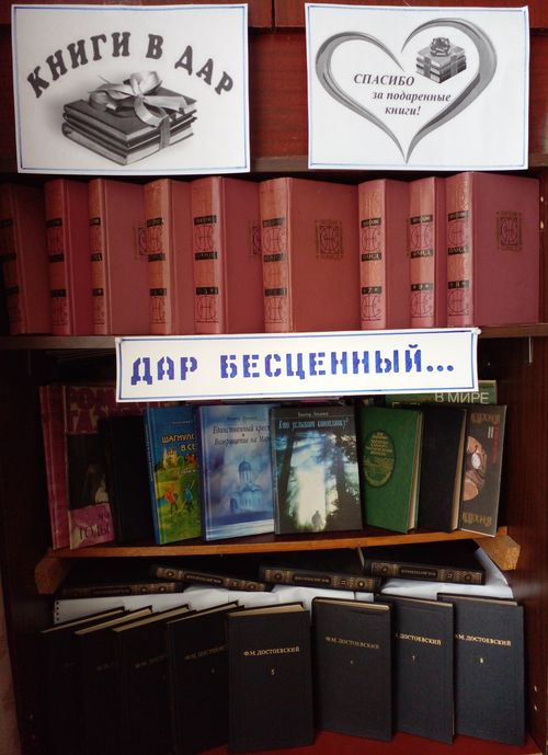 Среди подаренных книг - собрание сочинений Федора Михайловича Достоевского в 12 томах, куда вошли его лучшие произведения - повести и рассказы, знаменитые романы: "Преступление и наказание", "Идиот", "Братья Карамазовы", "Бесы" и другие...