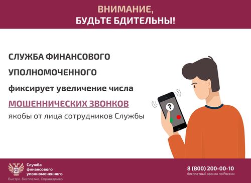В случае, если вы не обращались к финансовому уполномоченному, но при этом вам поступают звонки и сообщения от неизвестных лиц, представляющихся сотрудниками Службы финансового уполномоченного (или АНО «СОДФУ», или помощниками финансового уполномоченного, или финансовыми уполномоченными), не ведите с ними разговоры и не предоставляйте какие-либо персональные данные! Сотрудники Службы финансового уполномоченного никогда не звонят первыми с предложениями о подаче обращения финансовому уполномоченному, а также с предложением иных «услуг».